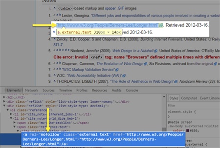 隨著Chrome DevTools,我們可以看到,外部鏈接在維基百科 rel="nofollow" 屬性。
