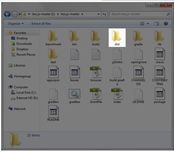 有很多文件和目錄內(nèi) less.js-master目錄,當(dāng)你打開它但我們只對里面的東西感興趣dist目錄(在開源行話是“分布”的簡稱目錄,生產(chǎn)使用的文件)。