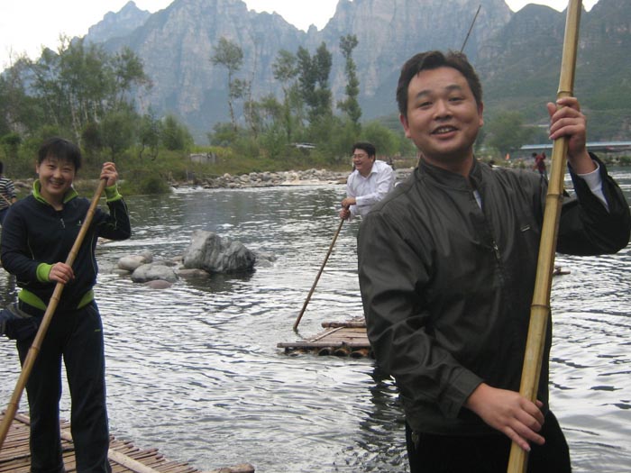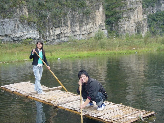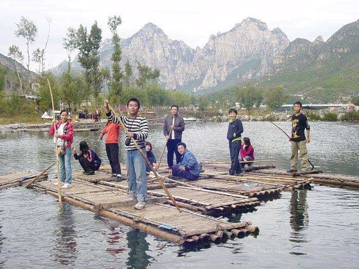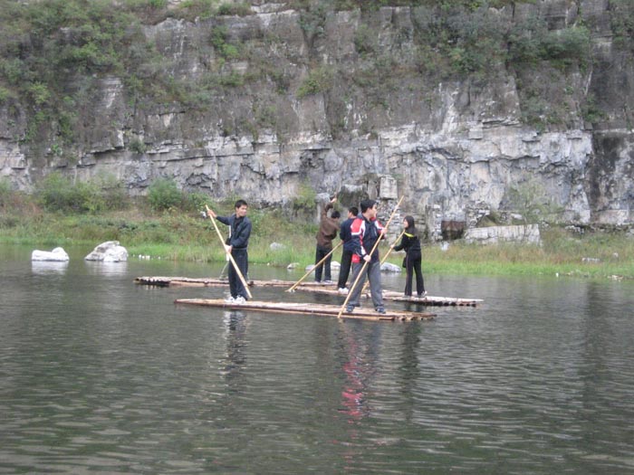“空山新雨后,天氣晚來秋”,山內(nèi)草木蔥蘢,花卉爭艷,樓臺亭閣,掩映其間,小島亭亭、輕舟點點、波光粼粼、水天相連,甬道以水泥加鵝卵石鑲嵌成各種美麗的圖案,鮮花點綴著草坪隨小路曲折蔓延。午后淡淡的白云間撕開了一道裂縫,一束陽光傾泄而下,兩岸的山崖灑滿了金色,大家興致勃勃地撐起了竹筏……
